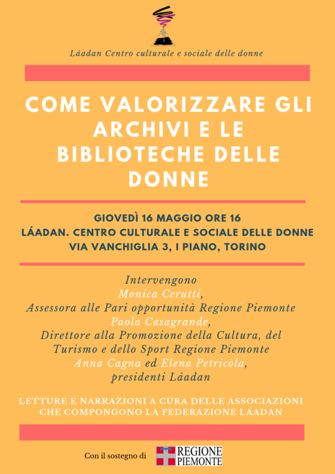 martedì 15 ottobre 2019 ore 18Láadan. Centro culturale e sociale delle donneVia Vanchiglia 3, I piano, Torino Láadan. Centro culturale e sociale delle donne ospita un incontro dedicato al tema della detenzione femminile organizzato dall’associazione SaperePlurale e inserito nel programma di “Liberazioni. Festival delle arti dentro e fuori” (Torino, 18 — 20 ottobre 2019). Il…