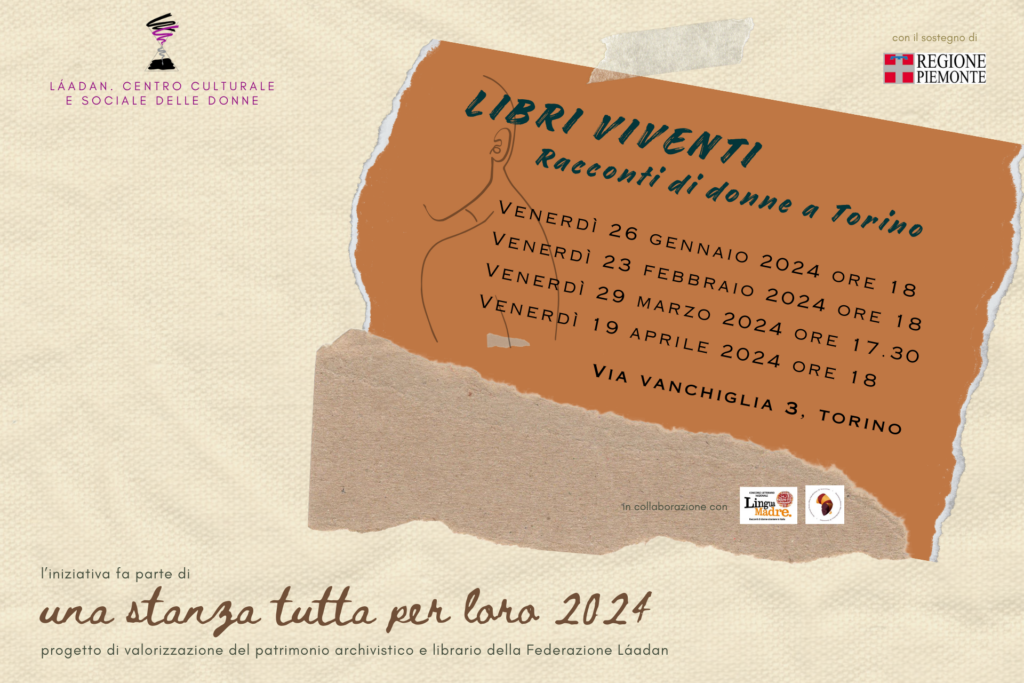 | LIBRI VIVENTI. CICLO DI INCONTRI via Vanchiglia 3, Torino L’idea dei libri viventi a Láadan nasce dal desiderio e dall’esigenza di raccogliere memoria delle donne di Torino di oggi — tra coloro che a Torino sono nate e coloro che ci sono arrivate nel tempo — e per trasformare la narrazione sulla città in maniera più rispettosa della storia di tutte e più vicina alla realtà. “Libri viventi” è quindi un ciclo di incontri, con cadenza mensile, per sfogliare dal vivo le storie di vita di donne che abitano la stessa città, ma intrecciano esperienze, provenienze e vissuti multiformi. Vieni ad ascoltarle! Calendario appuntamenti: - Venerdì 26 gennaio ore 18.00 - Venerdì 23 febbraio ore 18.00 - Venerdì 29 marzo ore 17.30 - Venerdì 19 aprile ore 18.00 Iniziativa realizzata col sostegno della Regione Piemonte. In collaborazione con Concorso letterario nazionale Lingua Madre e Associazione donne Africa Subsahariana e II generazione. Evento Fb |